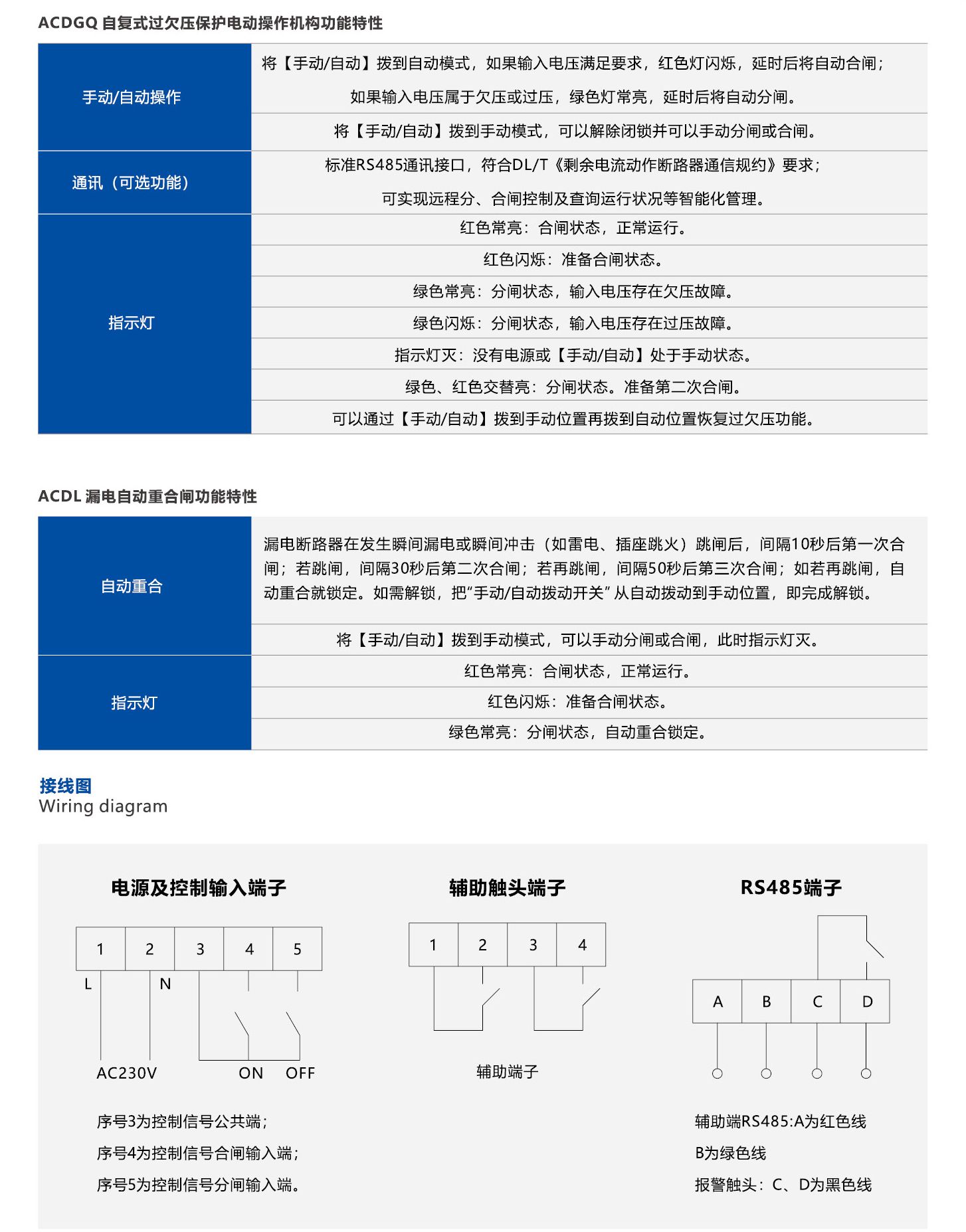 ACD口系列多功能電動操作機構是為小型斷路器及漏電斷路器的遠程操作設計的,該系列產品具有小體積、較高機電壽命、動作可靠、性能穩定和良好的人機交互界面。可分別構建小型電動操作機構、自復式過欠壓保護電動操作機構、漏電自動重合閘電動操作機構等功能產品。滿足JGJ242-2011《住宅建筑電氣設計規范》的要求。通過不同的組合能夠實現“遙信”、“遙測”、“遙控”等雙向通信,可以拼裝分勵脫扣器、欠壓脫扣器、輔助觸頭及報警觸頭等小型斷路器附件。廣泛應用于自動化控制和遠程控制的電氣線路。